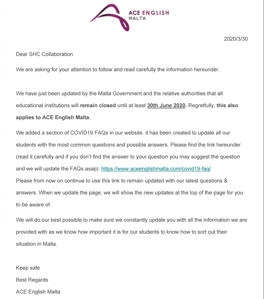 We added a section of COVID19 FAQs in our website. it has been created to update all our students with the most common questions and possible answers. Please find the link hereunder (read it carefully and if you don’t find the answer to your question you may suggest the question and we will update the FAQs asap): https://www.aceenglishmalta.com/covid19-faq/