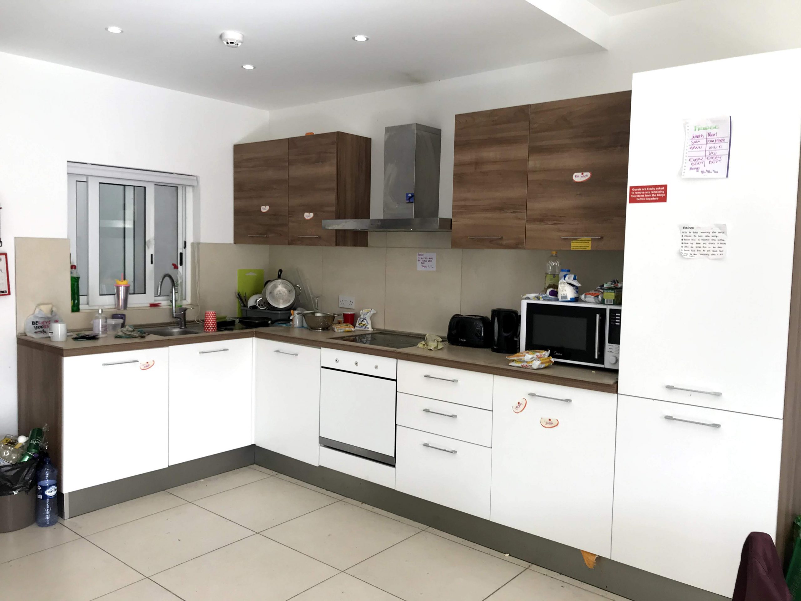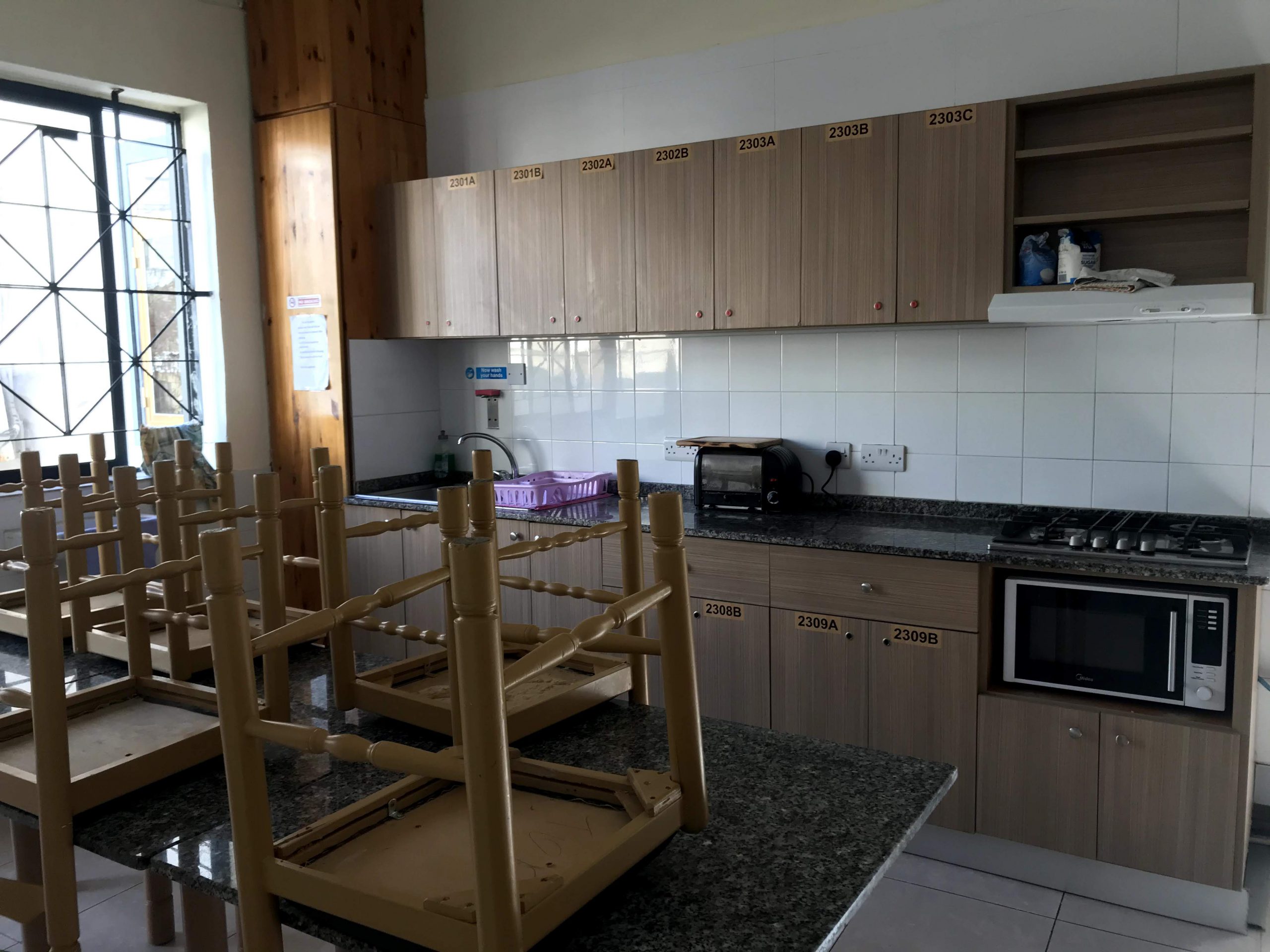 新しい寮でワンフロアがとても広く、設備も綺麗です。長期留学生向けに建てている寮のようです。