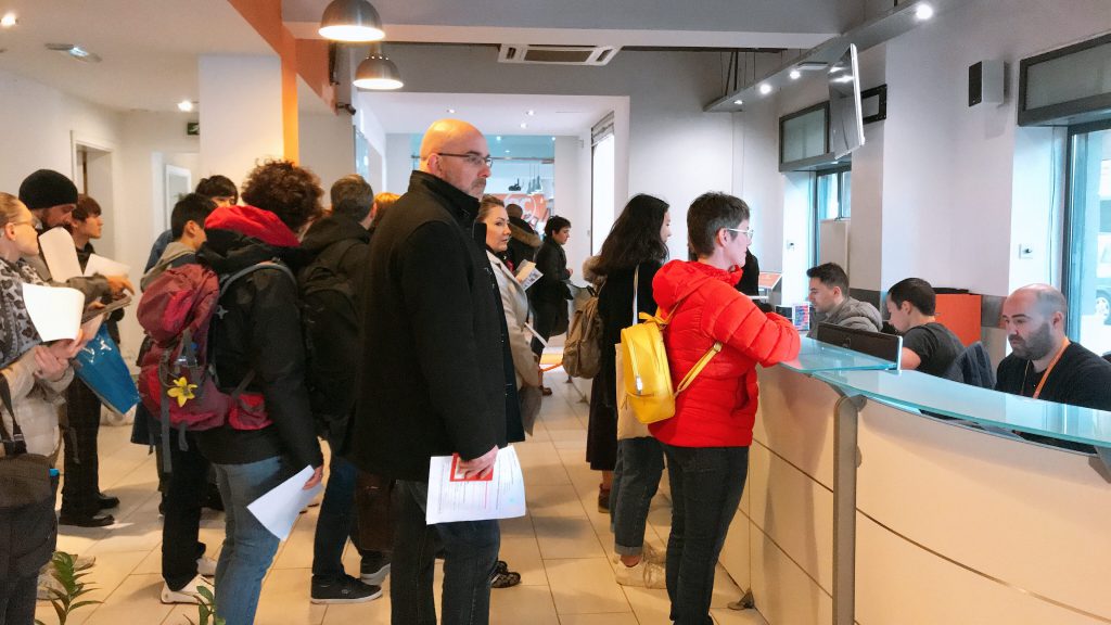 生徒はスタッフの説明のもとレセプションに並びパスポートを提示