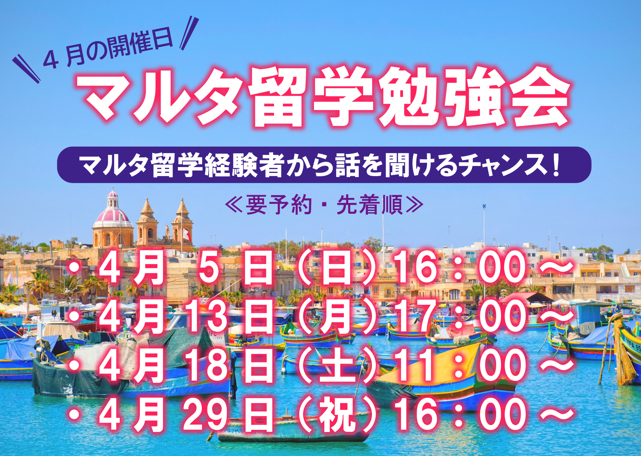 ———-✐マルタ留学勉強会 4月 開催日程詳細✐———-