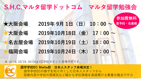 10月に大阪・名古屋・福岡の3都市で、マルタ留学勉強の開催が決定しました。