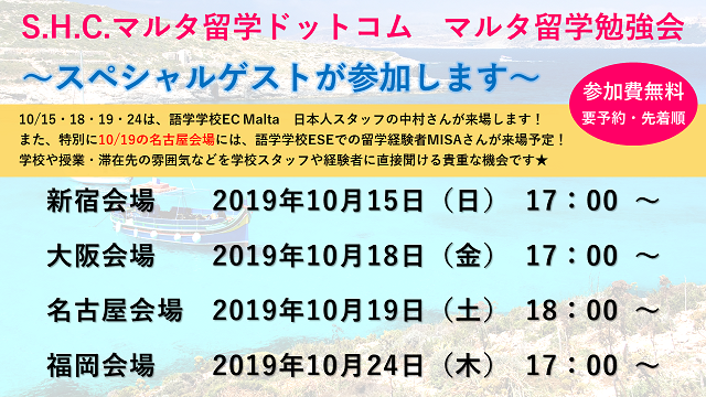 SHCマルタ留学ドットコムのマルタ留学勉強会は、10月15日・18日・19日・24日にスペシャルゲストが来場します!